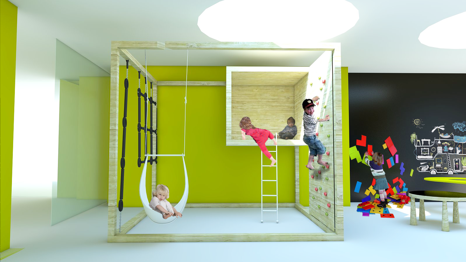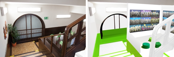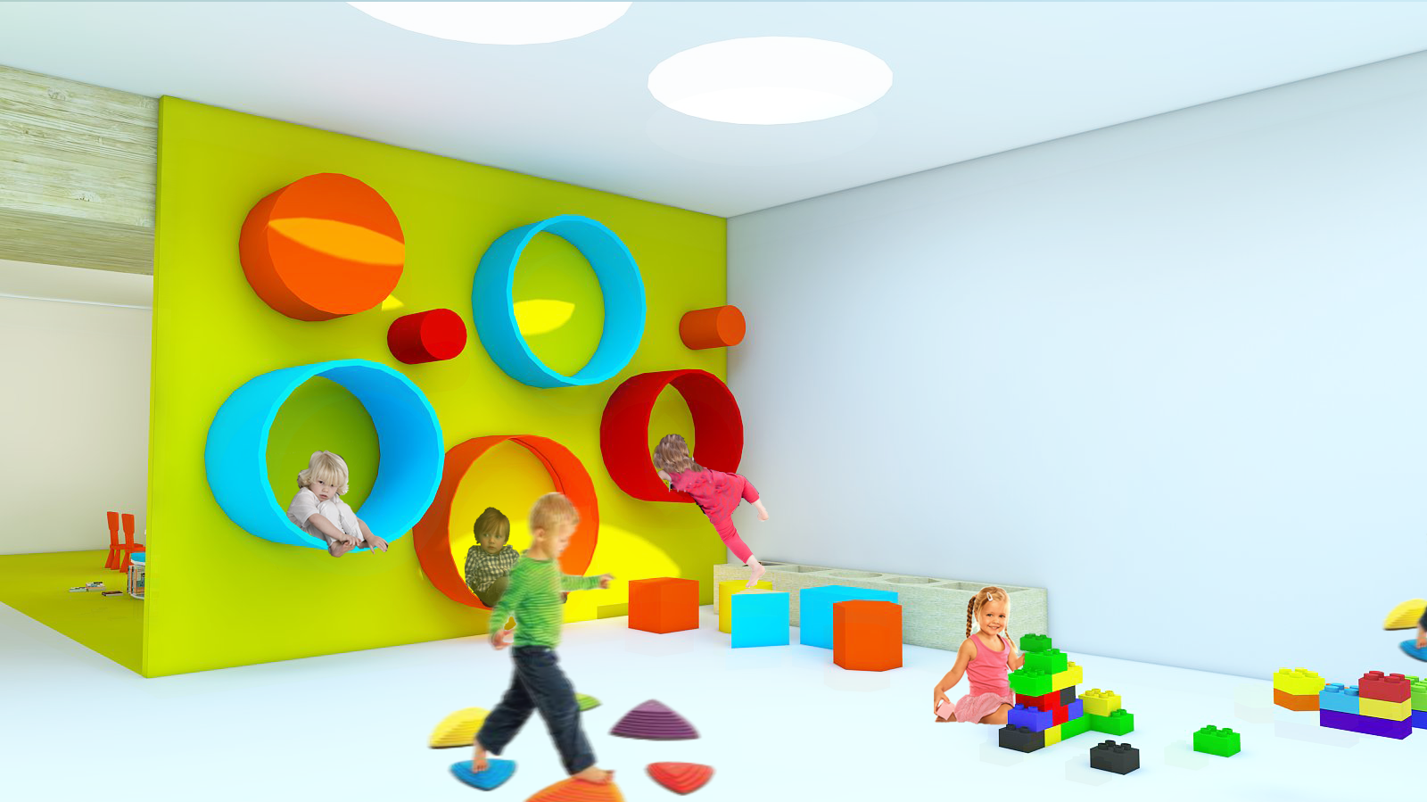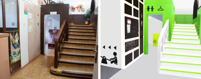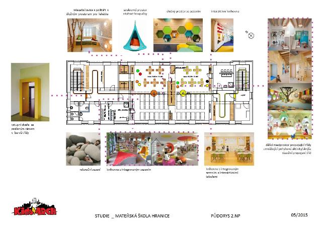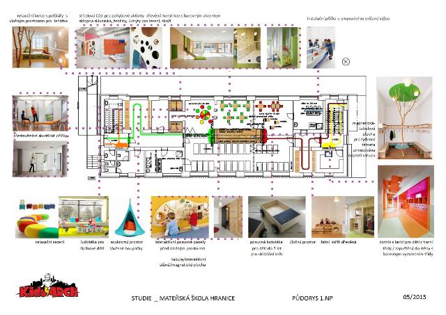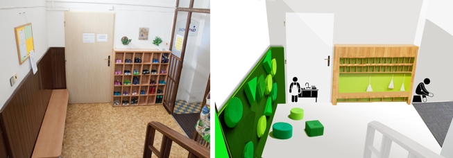 Zadání: návrh na úpravu vstupních prostor, které nyní nesplňují tyto požadavky: jednoduchá orientace, příjemný pocit v prostoru, dětská hravost, bezpečnost, prostor pro kreativitu, úložný prostor